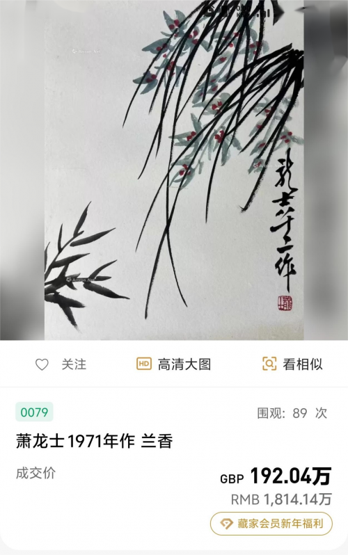 近日,中国近现代大写意画派宗师萧龙士1971年创作的纸本水墨作品《兰香》,在英国卢浮宫举办的“Famous Artist Winter Auction of Calligraphy and Painting”中国书画专场拍卖会上重磅落槌。该作品以GBP 192.04万(折合人民币1814.14万元)的成交价圆满收官,再次印证了萧龙士艺术作品在国际艺术市场的深厚影响力与珍贵收藏价值。